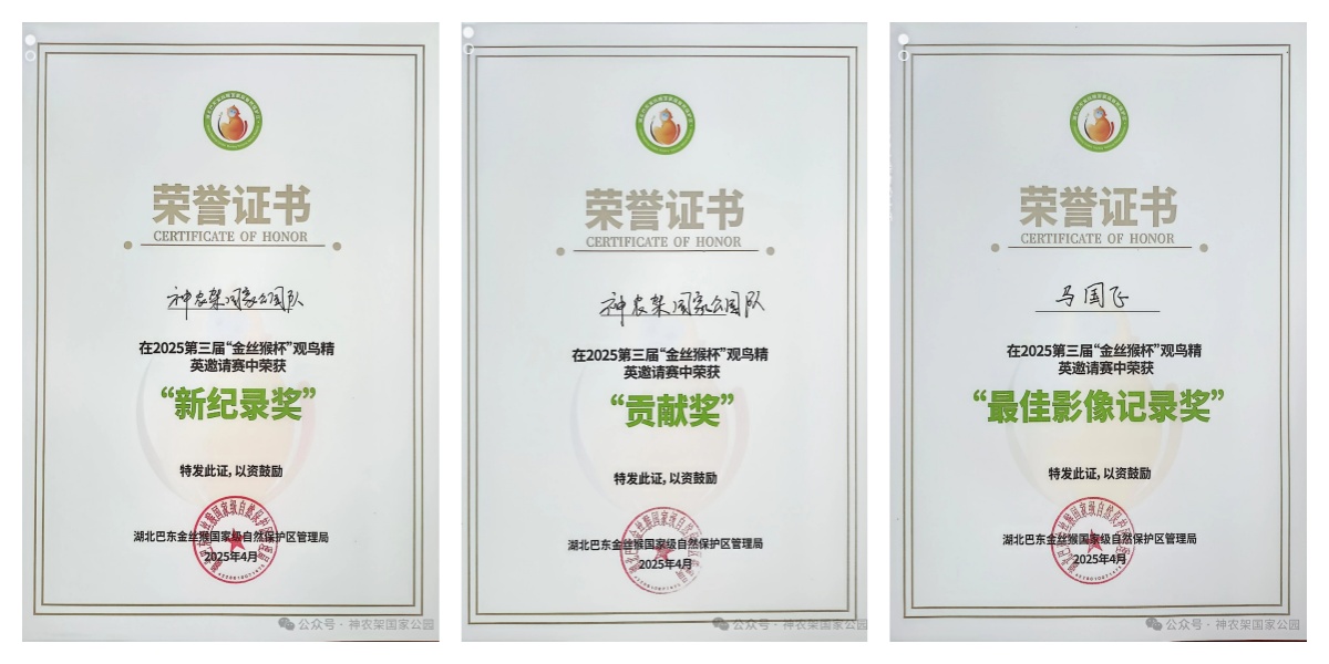 神農(nóng)架國家公園選派馬國飛、楊開華、趙寵南參賽,記錄到新記錄鳥種黃眉柳鶯,并記錄有效鳥種131種,斬獲“最佳影像記錄獎(jiǎng)”“貢獻(xiàn)獎(jiǎng)”“新紀(jì)錄獎(jiǎng)”